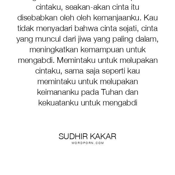 Engkau memintaku untuk melupakan cintaku, seakan-akan cinta itu disebabkan oleh oleh kemanjaanku. Kau tidak menyadari bahwa cinta sejati, cinta yang muncul dari jiwa yang paling dalam, meningkatkan kemampuan untuk mengabdi. Memintaku untuk melupakan cintaku, sama saja seperti kau memintaku untuk melupakan keimananku pada Tuhan dan kekuatanku untuk mengabdi