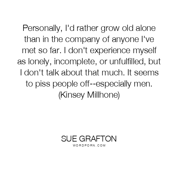 Personally, I'd rather grow old alone than in the company of anyone I've met so far. I don't experience myself as lonely, incomplete, or unfulfilled, but I don't talk about that much. It seems to piss people off--especially men. (Kinsey Millhone)