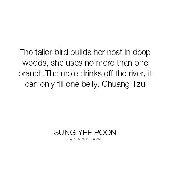 Copy Image The tailor bird builds her nest in deep woods, she uses no more than one branch.The mole drinks off the river, it can only fill one belly. Chuang Tzu Moms Typewriter A A SAVE THIS IMAGE