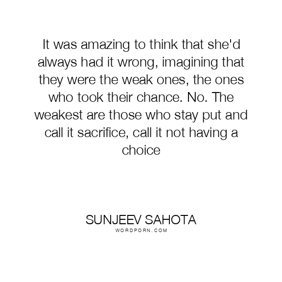 It was amazing to think that she'd always had it wrong, imagining that they were the weak ones, the ones who took their chance. No. The weakest are those who stay put and call it sacrifice, call it not having a choice