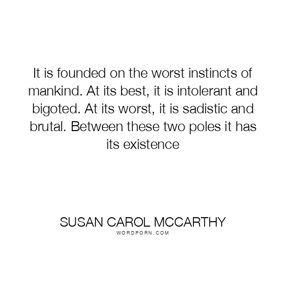 It is founded on the worst instincts of mankind. At its best, it is intolerant and bigoted. At its worst, it is sadistic and brutal. Between these two poles it has its existence