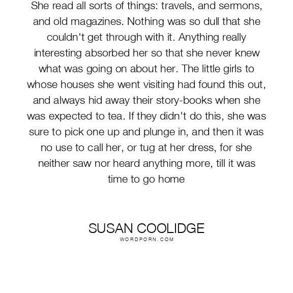 She read all sorts of things: travels, and sermons, and old magazines. Nothing was so dull that she couldn't get through with it. Anything really interesting absorbed her so that she never knew what was going on about her. The little girls to whose houses she went visiting had found this out, and always hid away their story-books when she was expected to tea. If they didn't do this, she was sure to pick one up and plunge in, and then it was no use to call her, or tug at her dress, for she neither saw nor heard anything more, till it was time to go home