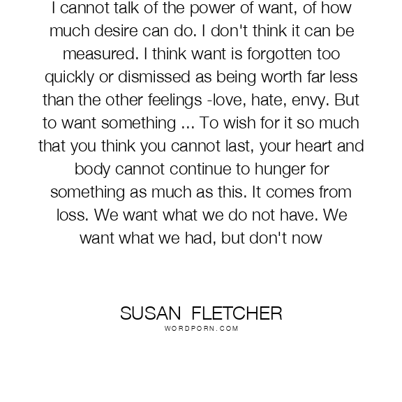 I cannot talk of the power of want, of how much desire can do. I don't think it can be measured. I think want is forgotten too quickly or dismissed as being worth far less than the other feelings -love, hate, envy. But to want something ... To wish for it so much that you think you cannot last, your heart and body cannot continue to hunger for something as much as this. It comes from loss. We want what we do not have. We want what we had, but don't now