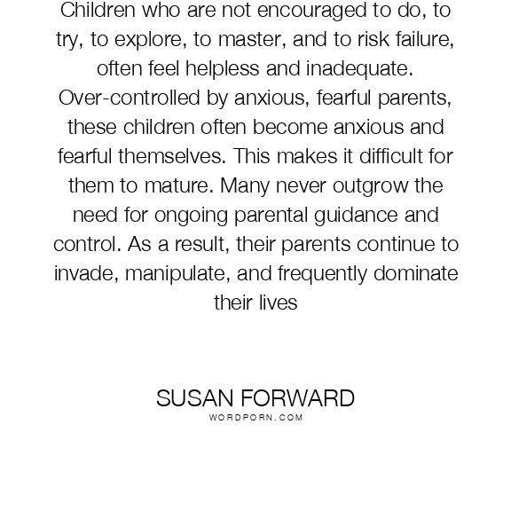Children who are not encouraged to do, to try, to explore, to master, and to risk failure, often feel helpless and inadequate. Over-controlled by anxious, fearful parents, these children often become anxious and fearful themselves. This makes it difficult for them to mature. Many never outgrow the need for ongoing parental guidance and control. As a result, their parents continue to invade, manipulate, and frequently dominate their lives