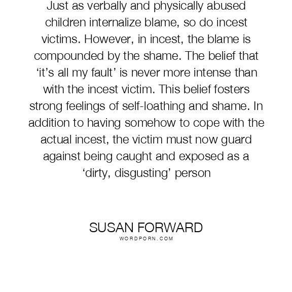 Just as verbally and physically abused children internalize blame, so do incest victims. However, in incest, the blame is compounded by the shame. The belief that ‘it’s all my fault’ is never more intense than with the incest victim. This belief fosters strong feelings of self-loathing and shame. In addition to having somehow to cope with the actual incest, the victim must now guard against being caught and exposed as a ‘dirty, disgusting’ person