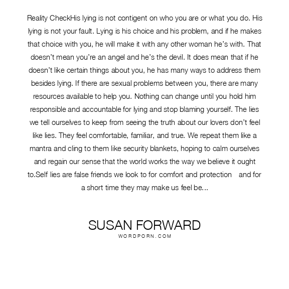 Reality CheckHis lying is not contigent on who you are or what you do. His lying is not your fault. Lying is his choice and his problem, and if he makes that choice with you, he will make it with any other woman he’s with. That doesn’t mean you’re an angel and he’s the devil. It does mean that if he doesn’t like certain things about you, he has many ways to address them besides lying. If there are sexual problems between you, there are many resources available to help you. Nothing can change until you hold him responsible and accountable for lying and stop blaming yourself. The lies we tell ourselves to keep from seeing the truth about our lovers don’t feel like lies. They feel comfortable, familiar, and true. We repeat them like a mantra and cling to them like security blankets, hoping to calm ourselves and regain our sense that the world works the way we believe it ought to.Self-lies are false friends we look to for comfort and protection—and for a short time they may make us feel better. But we can only keep the truth at bay for so long. Our self-lies can’t erase his lies, and as we’ll see, the longer we try to pretend they can, the more we deepen the hurt
