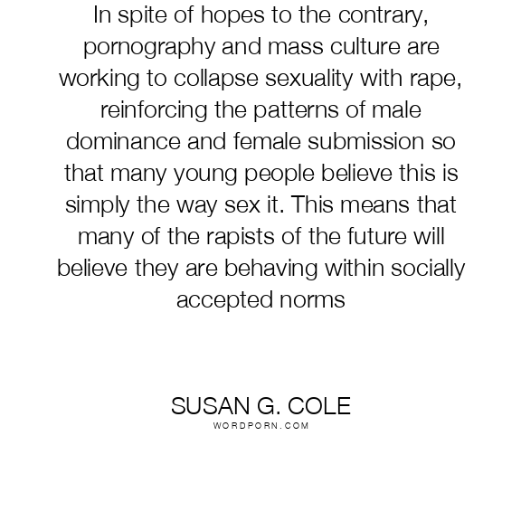 In spite of hopes to the contrary, pornography and mass culture are working to collapse sexuality with rape, reinforcing the patterns of male dominance and female submission so that many young people believe this is simply the way sex it. This means that many of the rapists of the future will believe they are behaving within socially accepted norms