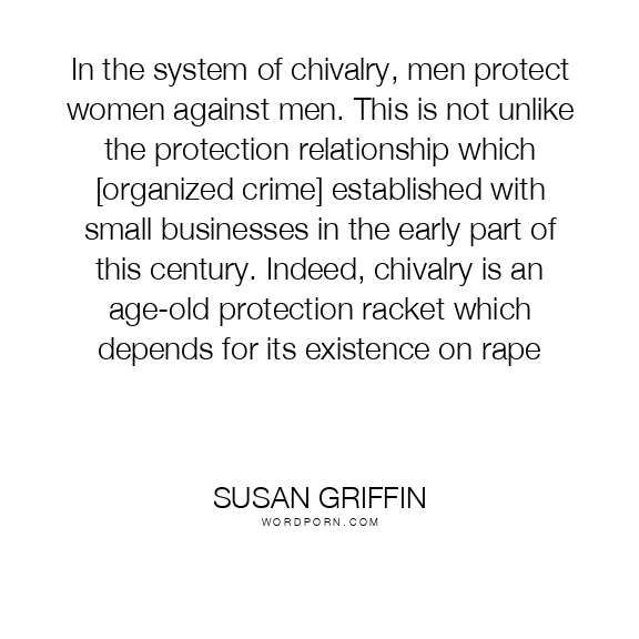 In the system of chivalry, men protect women against men. This is not unlike the protection relationship which [organized crime] established with small businesses in the early part of this century. Indeed, chivalry is an age-old protection racket which depends for its existence on rape
