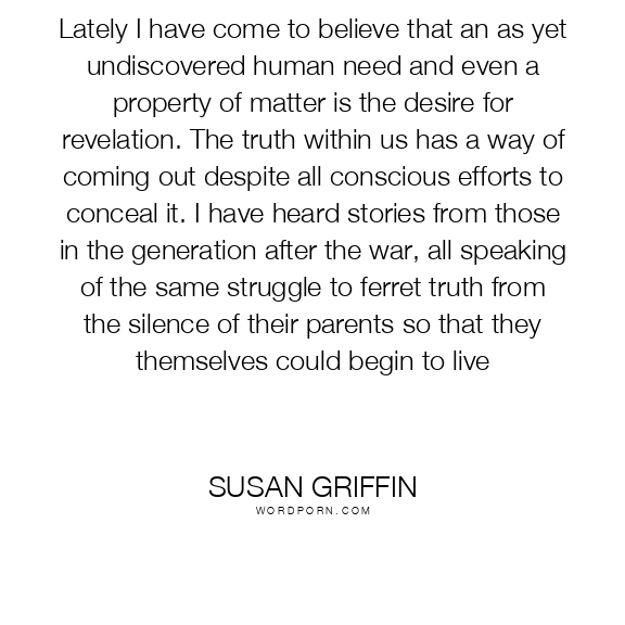 Lately I have come to believe that an as yet undiscovered human need and even a property of matter is the desire for revelation. The truth within us has a way of coming out despite all conscious efforts to conceal it. I have heard stories from those in the generation after the war, all speaking of the same struggle to ferret truth from the silence of their parents so that they themselves could begin to live