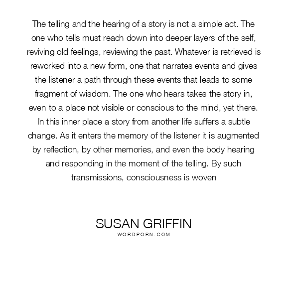 The telling and the hearing of a story is not a simple act. The one who tells must reach down into deeper layers of the self, reviving old feelings, reviewing the past. Whatever is retrieved is reworked into a new form, one that narrates events and gives the listener a path through these events that leads to some fragment of wisdom. The one who hears takes the story in, even to a place not visible or conscious to the mind, yet there. In this inner place a story from another life suffers a subtle change. As it enters the memory of the listener it is augmented by reflection, by other memories, and even the body hearing and responding in the moment of the telling. By such transmissions, consciousness is woven