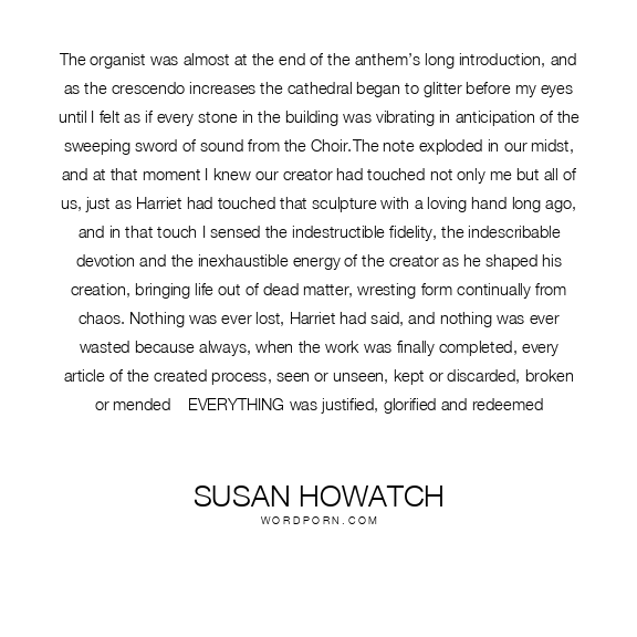 The organist was almost at the end of the anthem’s long introduction, and as the crescendo increases the cathedral began to glitter before my eyes until I felt as if every stone in the building was vibrating in anticipation of the sweeping sword of sound from the Choir.The note exploded in our midst, and at that moment I knew our creator had touched not only me but all of us, just as Harriet had touched that sculpture with a loving hand long ago, and in that touch I sensed the indestructible fidelity, the indescribable devotion and the inexhaustible energy of the creator as he shaped his creation, bringing life out of dead matter, wresting form continually from chaos. Nothing was ever lost, Harriet had said, and nothing was ever wasted because always, when the work was finally completed, every article of the created process, seen or unseen, kept or discarded, broken or mended – EVERYTHING was justified, glorified and redeemed