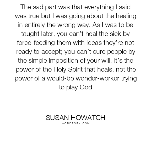 The sad part was that everything I said was true but I was going about the healing in entirely the wrong way. As I was to be taught later, you can’t heal the sick by force-feeding them with ideas they’re not ready to accept; you can’t cure people by the simple imposition of your will. It’s the power of the Holy Spirit that heals, not the power of a would-be wonder-worker trying to play God