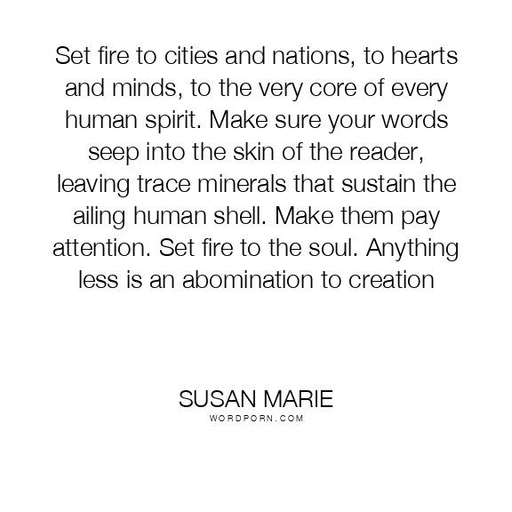 Set fire to cities and nations, to hearts and minds, to the very core of every human spirit. Make sure your words seep into the skin of the reader, leaving trace minerals that sustain the ailing human shell. Make them pay attention. Set fire to the soul. Anything less is an abomination to creation