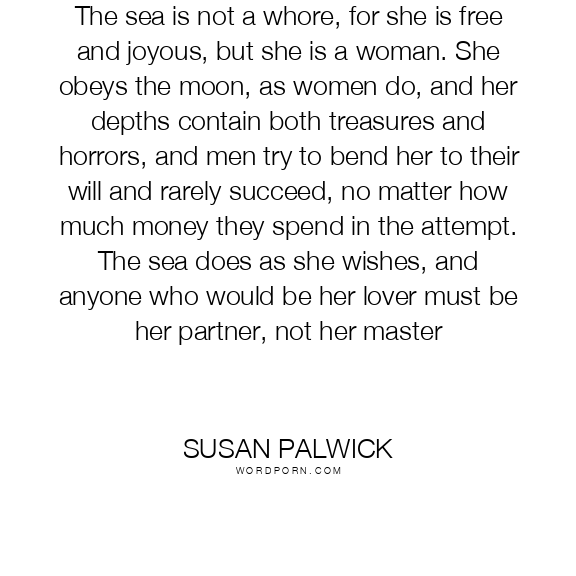 The sea is not a whore, for she is free and joyous, but she is a woman. She obeys the moon, as women do, and her depths contain both treasures and horrors, and men try to bend her to their will and rarely succeed, no matter how much money they spend in the attempt. The sea does as she wishes, and anyone who would be her lover must be her partner, not her master