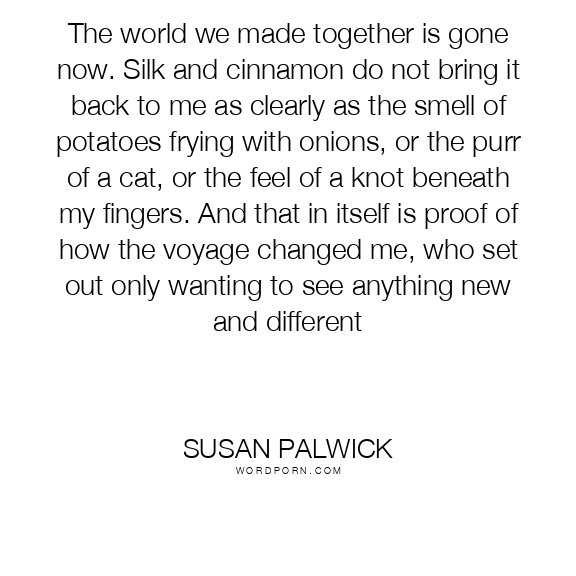 The world we made together is gone now. Silk and cinnamon do not bring it back to me as clearly as the smell of potatoes frying with onions, or the purr of a cat, or the feel of a knot beneath my fingers. And that in itself is proof of how the voyage changed me, who set out only wanting to see anything new and different