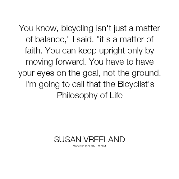 You know, bicycling isn't just a matter of balance," I said. "it's a matter of faith. You can keep upright only by moving forward. You have to have your eyes on the goal, not the ground. I'm going to call that the Bicyclist's Philosophy of Life