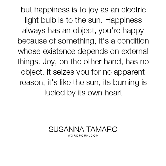 but happiness is to joy as an electric light bulb is to the sun. Happiness always has an object, you're happy because of something, it's a condition whose existence depends on external things. Joy, on the other hand, has no object. It seizes you for no apparent reason, it's like the sun, its burning is fueled by its own heart