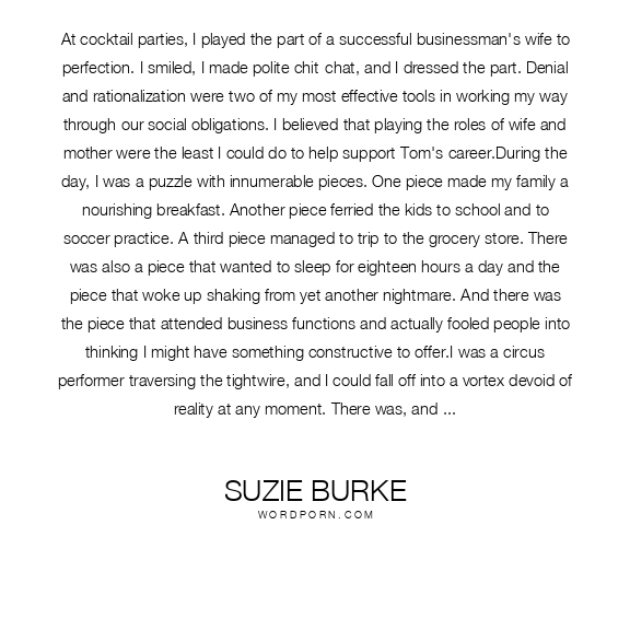At cocktail parties, I played the part of a successful businessman's wife to perfection. I smiled, I made polite chit-chat, and I dressed the part. Denial and rationalization were two of my most effective tools in working my way through our social obligations. I believed that playing the roles of wife and mother were the least I could do to help support Tom's career.During the day, I was a puzzle with innumerable pieces. One piece made my family a nourishing breakfast. Another piece ferried the kids to school and to soccer practice. A third piece managed to trip to the grocery store. There was also a piece that wanted to sleep for eighteen hours a day and the piece that woke up shaking from yet another nightmare. And there was the piece that attended business functions and actually fooled people into thinking I might have something constructive to offer.I was a circus performer traversing the tightwire, and I could fall off into a vortex devoid of reality at any moment. There was, and had been for a very long time, an intense sense of despair. A self-deprecating voice inside told me I had no chance of getting better. I lived in an emotional black hole.p20-21, talking about dissociative identity disorder (formerly multiple personality disorder)