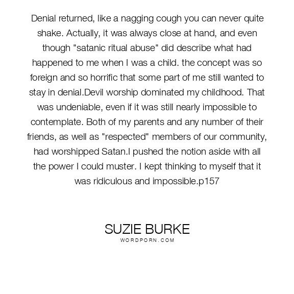 Denial returned, like a nagging cough you can never quite shake. Actually, it was always close at hand, and even though "satanic ritual abuse" did describe what had happened to me when I was a child. the concept was so foreign and so horrific that some part of me still wanted to stay in denial.Devil worship dominated my childhood. That was undeniable, even if it was still nearly impossible to contemplate. Both of my parents and any number of their friends, as well as "respected" members of our community, had worshipped Satan.I pushed the notion aside with all the power I could muster. I kept thinking to myself that it was ridiculous and impossible.p157