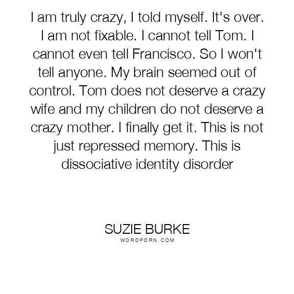 I am truly crazy, I told myself. It's over. I am not fixable. I cannot tell Tom. I cannot even tell Francisco. So I won't tell anyone. My brain seemed out of control. Tom does not deserve a crazy wife and my children do not deserve a crazy mother. I finally get it. This is not just repressed memory. This is dissociative identity disorder