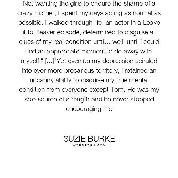 Not wanting the girls to endure the shame of a crazy mother, I spent my days acting as normal as possible. I walked through life, an actor in a Leave it to Beaver episode, determined to disguise all clues of my real condition until... well, until I could find an appropriate moment to do away with myself." [...]"Yet even as my depression spiraled into ever more precarious territory, I retained an uncanny ability to disguise my true mental condition from everyone except Tom. He was my sole source of strength and he never stopped encouraging me