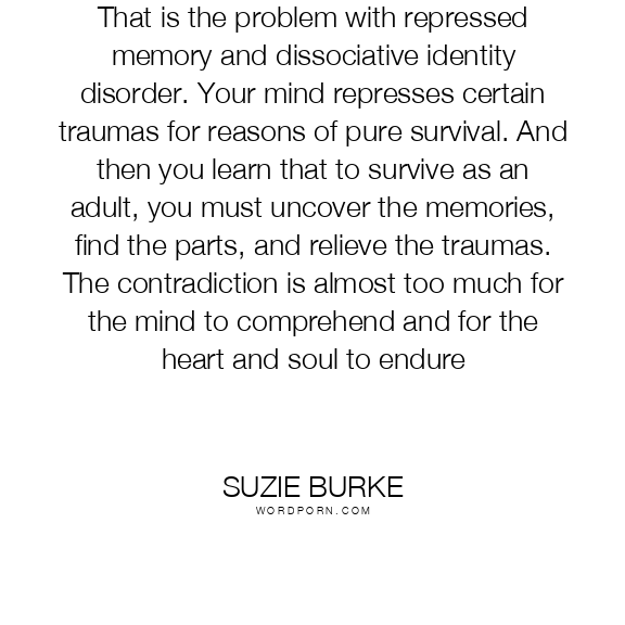 That is the problem with repressed memory and dissociative identity disorder. Your mind represses certain traumas for reasons of pure survival. And then you learn that to survive as an adult, you must uncover the memories, find the parts, and relieve the traumas. The contradiction is almost too much for the mind to comprehend and for the heart and soul to endure
