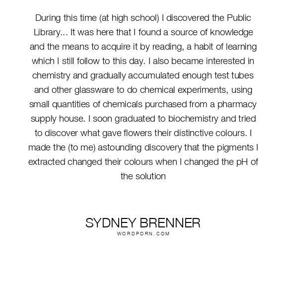 During this time (at high school) I discovered the Public Library... It was here that I found a source of knowledge and the means to acquire it by reading, a habit of learning which I still follow to this day. I also became interested in chemistry and gradually accumulated enough test tubes and other glassware to do chemical experiments, using small quantities of chemicals purchased from a pharmacy supply house. I soon graduated to biochemistry and tried to discover what gave flowers their distinctive colours. I made the (to me) astounding discovery that the pigments I extracted changed their colours when I changed the pH of the solution
