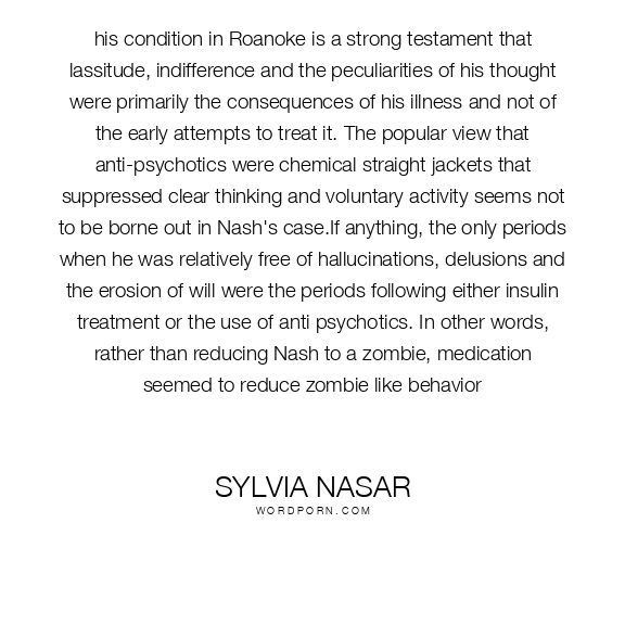 his condition in Roanoke is a strong testament that lassitude, indifference and the peculiarities of his thought were primarily the consequences of his illness and not of the early attempts to treat it. The popular view that anti-psychotics were chemical straight jackets that suppressed clear thinking and voluntary activity seems not to be borne out in Nash's case.If anything, the only periods when he was relatively free of hallucinations, delusions and the erosion of will were the periods following either insulin treatment or the use of anti psychotics. In other words, rather than reducing Nash to a zombie, medication seemed to reduce zombie like behavior
