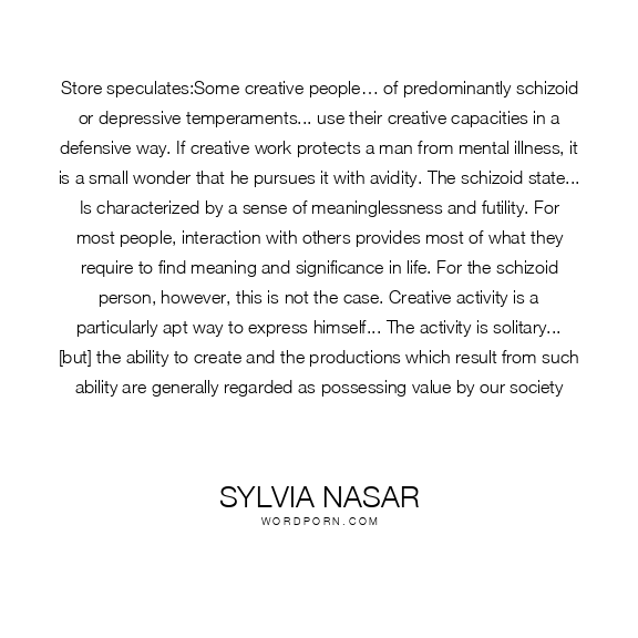 Store speculates:Some creative people… of predominantly schizoid or depressive temperaments... use their creative capacities in a defensive way. If creative work protects a man from mental illness, it is a small wonder that he pursues it with avidity. The schizoid state... Is characterized by a sense of meaninglessness and futility. For most people, interaction with others provides most of what they require to find meaning and significance in life. For the schizoid person, however, this is not the case. Creative activity is a particularly apt way to express himself... The activity is solitary... [but] the ability to create and the productions which result from such ability are generally regarded as possessing value by our society