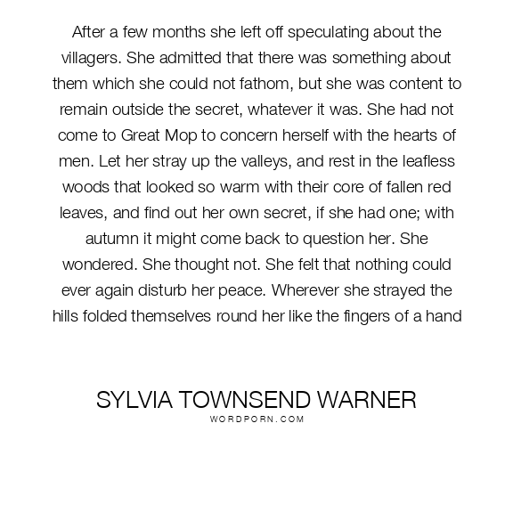 After a few months she left off speculating about the villagers. She admitted that there was something about them which she could not fathom, but she was content to remain outside the secret, whatever it was. She had not come to Great Mop to concern herself with the hearts of men. Let her stray up the valleys, and rest in the leafless woods that looked so warm with their core of fallen red leaves, and find out her own secret, if she had one; with autumn it might come back to question her. She wondered. She thought not. She felt that nothing could ever again disturb her peace. Wherever she strayed the hills folded themselves round her like the fingers of a hand