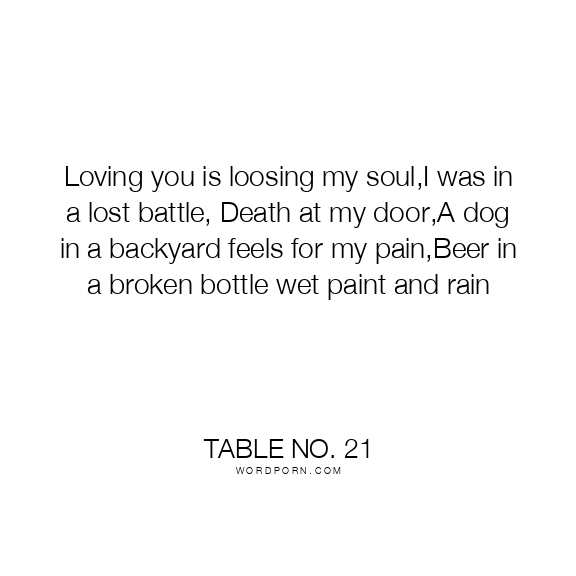 Copy Image Loving you is loosing my soul,I was in a lost battle, Death at my door,A dog in a backyard feels for my pain,Beer in a broken bottle wet paint and rain Moms Typewriter A A SAVE THIS IMAGE
