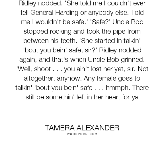 Ridley nodded. 'She told me I couldn't ever tell General Harding or anybody else. Told me I wouldn't be safe.' 'Safe?' Uncle Bob stopped rocking and took the pipe from between his teeth. 'She started in talkin' 'bout you bein' safe, sir?' Ridley nodded again, and that's when Uncle Bob grinned. 'Well, shoot . . . you ain't lost her yet, sir. Not altogether, anyhow. Any female goes to talkin' 'bout you bein' safe . . . hmmph. There still be somethin' left in her heart for ya