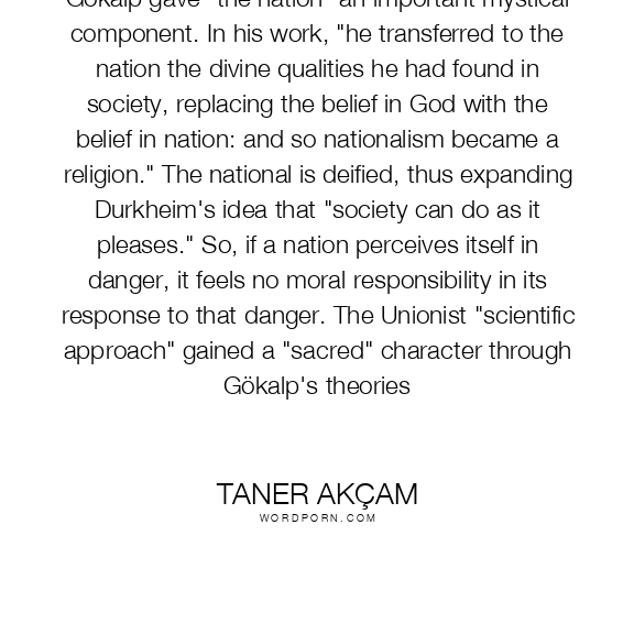 Gökalp gave "the nation" an important mystical component. In his work, "he transferred to the nation the divine qualities he had found in society, replacing the belief in God with the belief in nation: and so nationalism became a religion." The national is deified, thus expanding Durkheim's idea that "society can do as it pleases." So, if a nation perceives itself in danger, it feels no moral responsibility in its response to that danger. The Unionist "scientific approach" gained a "sacred" character through Gökalp's theories