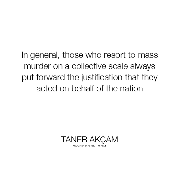 Taner Akçam quote. In general, those who resort to mass murder on a collective scale always put forward the justification that they acted on behalf of the nation