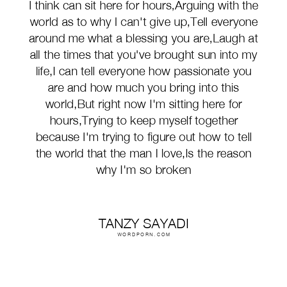 I think can sit here for hours,Arguing with the world as to why I can't give up,Tell everyone around me what a blessing you are,Laugh at all the times that you've brought sun into my life,I can tell everyone how passionate you are and how much you bring into this world,But right now I'm sitting here for hours,Trying to keep myself together because I'm trying to figure out how to tell the world that the man I love,Is the reason why I'm so broken
