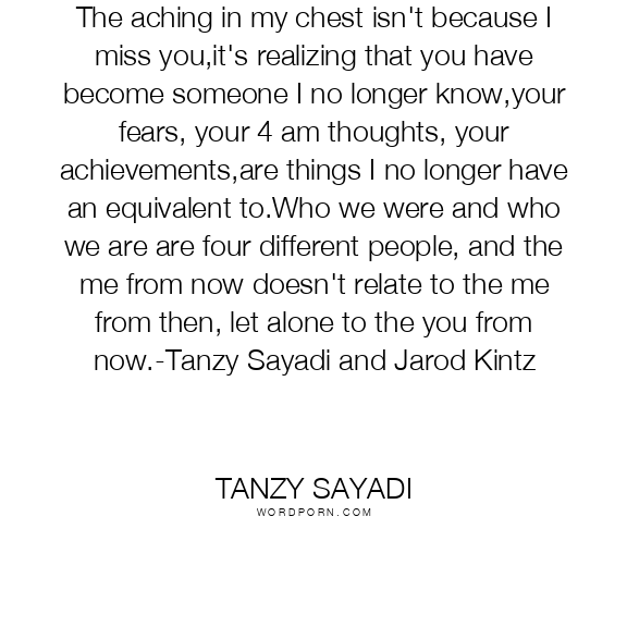 The aching in my chest isn't because I miss you,it's realizing that you have become someone I no longer know,your fears, your 4 am thoughts, your achievements,are things I no longer have an equivalent to.Who we were and who we are are four different people, and the me from now doesn't relate to the me from then, let alone to the you from now.-Tanzy Sayadi and Jarod Kintz