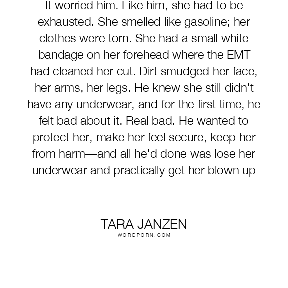 It worried him. Like him, she had to be exhausted. She smelled like gasoline; her clothes were torn. She had a small white bandage on her forehead where the EMT had cleaned her cut. Dirt smudged her face, her arms, her legs. He knew she still didn't have any underwear, and for the first time, he felt bad about it. Real bad. He wanted to protect her, make her feel secure, keep her from harm—and all he'd done was lose her underwear and practically get her blown up