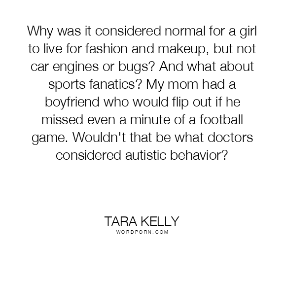 Why was it considered normal for a girl to live for fashion and makeup, but not car engines or bugs? And what about sports fanatics? My mom had a boyfriend who would flip out if he missed even a minute of a football game. Wouldn't that be what doctors considered autistic behavior?