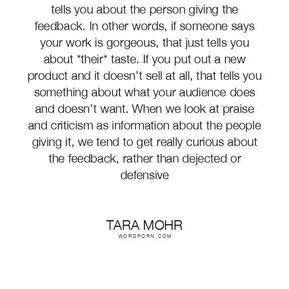 Feedback doesn’t tell you about yourself. It tells you about the person giving the feedback. In other words, if someone says your work is gorgeous, that just tells you about *their* taste. If you put out a new product and it doesn’t sell at all, that tells you something about what your audience does and doesn’t want. When we look at praise and criticism as information about the people giving it, we tend to get really curious about the feedback, rather than dejected or defensive