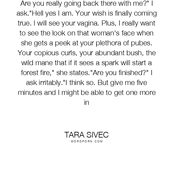 Are you really going back there with me?" I ask."Hell yes I am. Your wish is finally coming true. I will see your vagina. Plus, I really want to see the look on that woman's face when she gets a peek at your plethora of pubes. Your copious curls, your abundant bush, the wild mane that if it sees a spark will start a forest fire," she states."Are you finished?" I ask irritably."I think so. But give me five minutes and I might be able to get one more in
