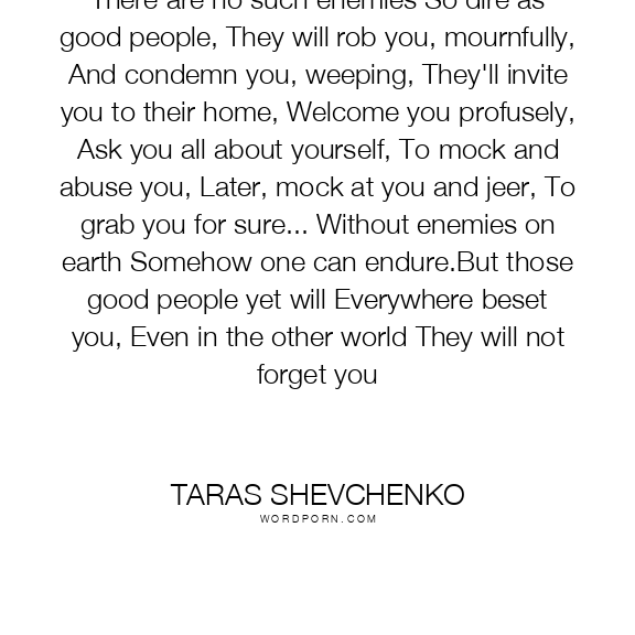 There are no such enemies So dire as good people, They will rob you, mournfully, And condemn you, weeping, They'll invite you to their home, Welcome you profusely, Ask you all about yourself, To mock and abuse you, Later, mock at you and jeer, To grab you for sure... Without enemies on earth Somehow one can endure.But those good people yet will Everywhere beset you, Even in the other world They will not forget you