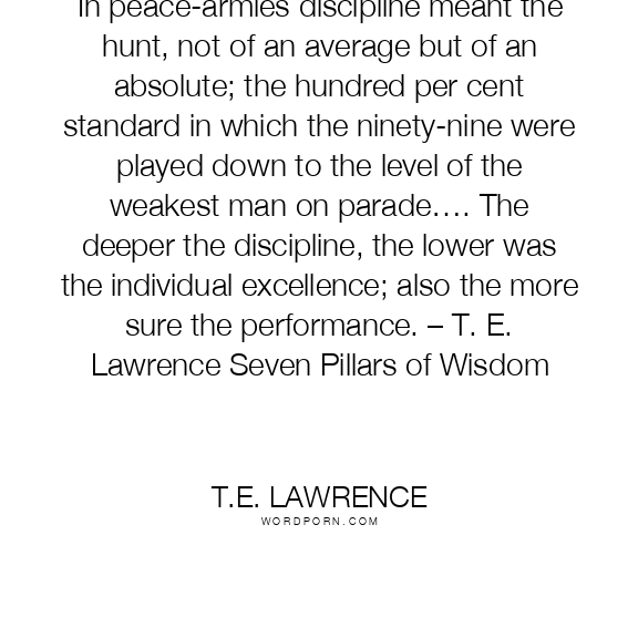 In peace-armies discipline meant the hunt, not of an average but of an absolute; the hundred per cent standard in which the ninety-nine were played down to the level of the weakest man on parade…. The deeper the discipline, the lower was the individual excellence; also the more sure the performance. – T. E. Lawrence Seven Pillars of Wisdom