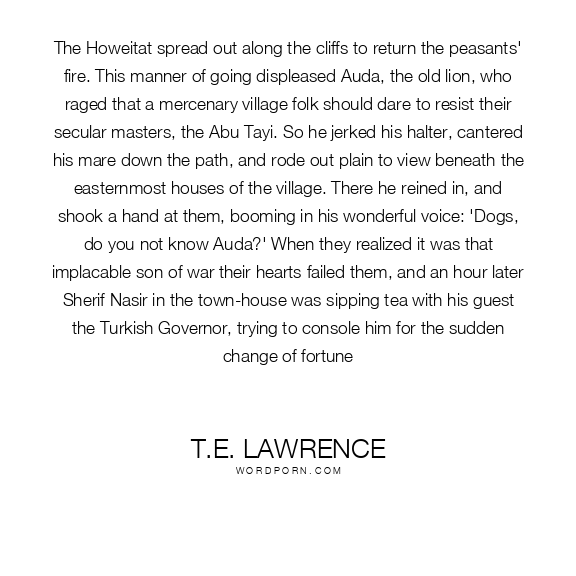 The Howeitat spread out along the cliffs to return the peasants' fire. This manner of going displeased Auda, the old lion, who raged that a mercenary village folk should dare to resist their secular masters, the Abu Tayi. So he jerked his halter, cantered his mare down the path, and rode out plain to view beneath the easternmost houses of the village. There he reined in, and shook a hand at them, booming in his wonderful voice: 'Dogs, do you not know Auda?' When they realized it was that implacable son of war their hearts failed them, and an hour later Sherif Nasir in the town-house was sipping tea with his guest the Turkish Governor, trying to console him for the sudden change of fortune