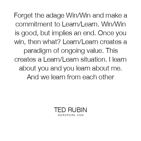 Forget the adage Win/Win and make a commitment to Learn/Learn. Win/Win is good, but implies an end. Once you win, then what? Learn/Learn creates a paradigm of ongoing value. This creates a Learn/Learn situation. I learn about you and you learn about me. And we learn from each other