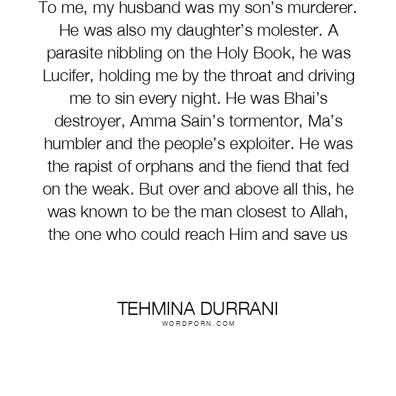 To me, my husband was my son’s murderer. He was also my daughter’s molester. A parasite nibbling on the Holy Book, he was Lucifer, holding me by the throat and driving me to sin every night. He was Bhai’s destroyer, Amma Sain’s tormentor, Ma’s humbler and the people’s exploiter. He was the rapist of orphans and the fiend that fed on the weak. But over and above all this, he was known to be the man closest to Allah, the one who could reach Him and save us