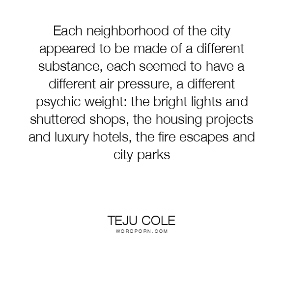 Each neighborhood of the city appeared to be made of a different substance, each seemed to have a different air pressure, a different psychic weight: the bright lights and shuttered shops, the housing projects and luxury hotels, the fire escapes and city parks