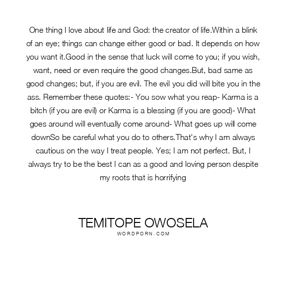 One thing I love about life and God: the creator of life.Within a blink of an eye; things can change either good or bad. It depends on how you want it.Good in the sense that luck will come to you; if you wish, want, need or even require the good changes.But, bad same as good changes; but, if you are evil. The evil you did will bite you in the ass. Remember these quotes:- You sow what you reap- Karma is a bitch (if you are evil) or Karma is a blessing (if you are good)- What goes around will eventually come around- What goes up will come downSo be careful what you do to others.That's why I am always cautious on the way I treat people. Yes; I am not perfect. But, I always try to be the best I can as a good and loving person despite my roots that is horrifying