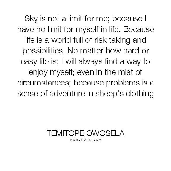 Sky is not a limit for me; because I have no limit for myself in life. Because life is a world full of risk taking and possibilities. No matter how hard or easy life is; I will always find a way to enjoy myself; even in the mist of circumstances; because problems is a sense of adventure in sheep's clothing