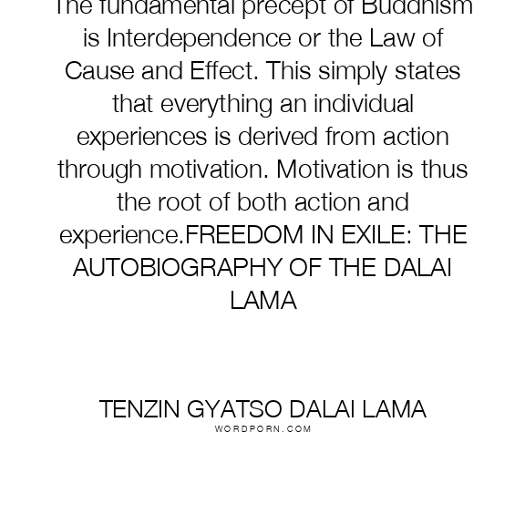 The fundamental precept of Buddhism is Interdependence or the Law of Cause and Effect. This simply states that everything an individual experiences is derived from action through motivation. Motivation is thus the root of both action and experience.FREEDOM IN EXILE: THE AUTOBIOGRAPHY OF THE DALAI LAMA