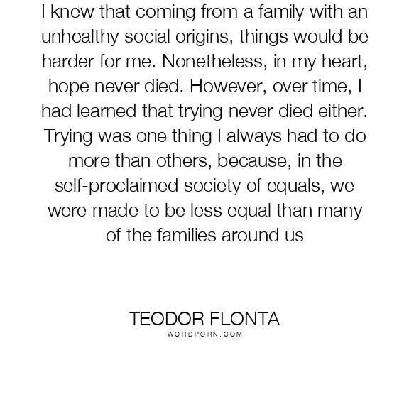 I knew that coming from a family with an unhealthy social origins, things would be harder for me. Nonetheless, in my heart, hope never died. However, over time, I had learned that trying never died either. Trying was one thing I always had to do more than others, because, in the self-proclaimed society of equals, we were made to be less equal than many of the families around us